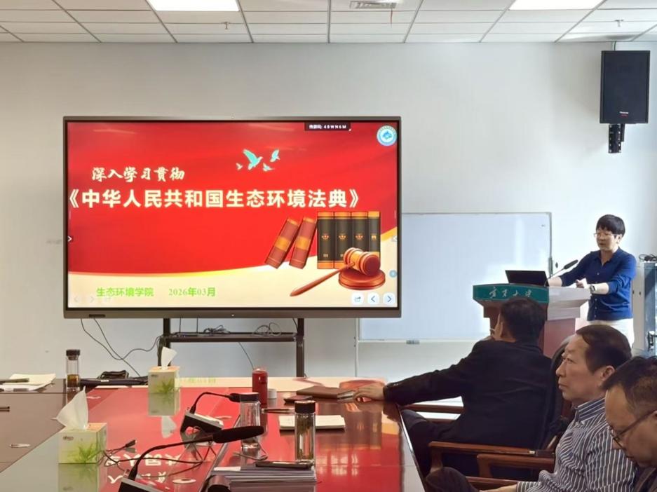 座谈会交流环节,五位师生代表结合各自工作与学习实际分享学习体会。杜灵通教授、生态系党支部书记马飞、环境科学与工程系党支部书记杨帆分别从专业课程体系改革、科研选题方向优化、特色学科建设布局等角度,交流了法典学习对教学科研工作的启发,提出要将《生态环境法典》相关内容融入本科核心课程、研究生专题教学及科研项目设计的具体方案,着力培养契合新时代生态环境法治建设需求的复合型专业人才。博士生代表楼科尔、硕士生代表祁迹结合自身研究方向,分享了法典对生态环境领域学术研究、实践应用的指导价值,表示将以此次学习为契机,进一步夯实专业基础、提升法治素养,切实将法典精神转化为开展科研实践、服务地方生态建设的实际行动。