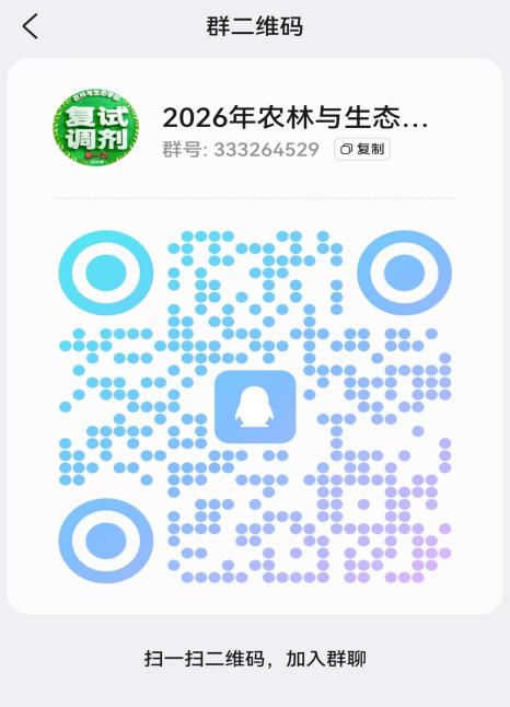 请接到调剂复试通知,确认参加复试的考生尽快加入“2026年农林与生态学部调剂复试QQ群”(群号:333264529,群二维码见下图),以便接收相关通知。进群后,请更改昵称为“姓名+报考学院+报考专业(方向)+联系电话”。金沙集团1862cc(润泽书院)拟定于2026年4月8日接到调剂复试通知后至4月9日12:00前进行线上资格审核,请考生将资格审核材料以“姓名+学院+专业+联系电话”命名,连同缴费截图一起压缩发送至指定邮箱1943636468@qq.com;4月9日-10日进行线上复试,复试实施方案、具体日程安排及资格审查、学院调剂信息等详见附件。